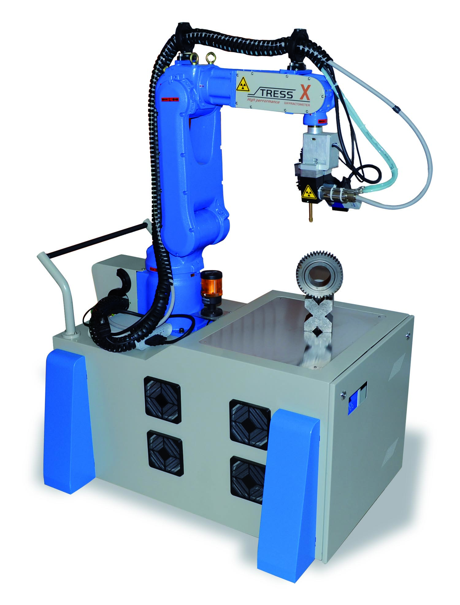 STRESS-X殘余應力分析儀,符合ASTM E915及EN 15305殘余應力國際分析檢測標準。儀器的衍射單元安裝在6自由度的機器人臂上,通過移動機械臂可對各種形狀和尺寸的樣品進行檢測。整個測試系統可封裝在密閉的艙體中用于實驗室分析,也可安裝在四輪合金推車上用于現場分析,進行移動測量大型工件各個部位的殘余應力。